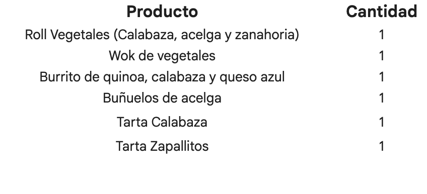 El pack vegetariano incluye los siguientes productos y cantidades de cada uno: